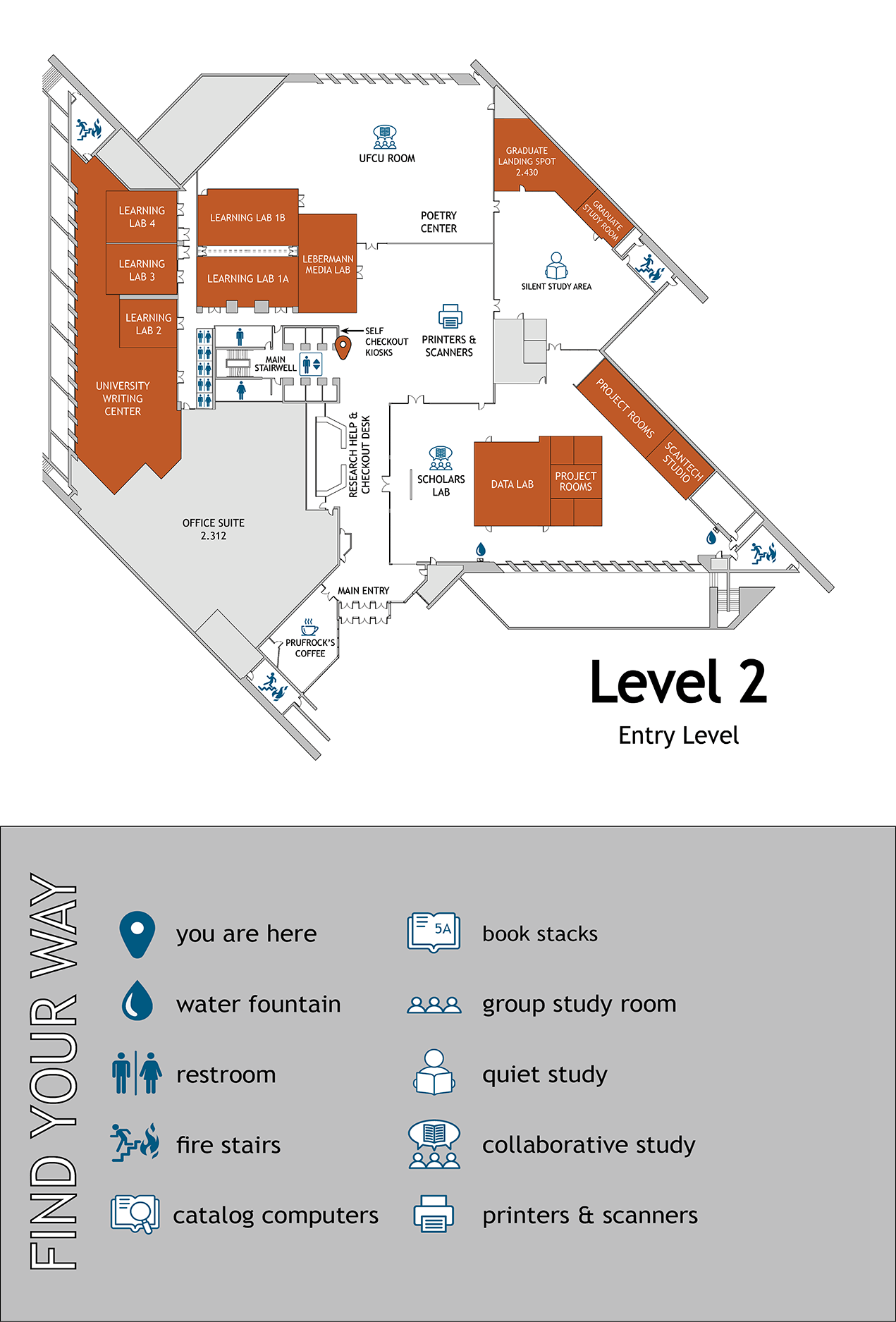 Entry level of the PCL. Computer lab, quick print stations, research help & checkout desk, Learning labs, Media lab, Data lab, Graduate Landing Spot, UFCU Room, study rooms, University Writing Center