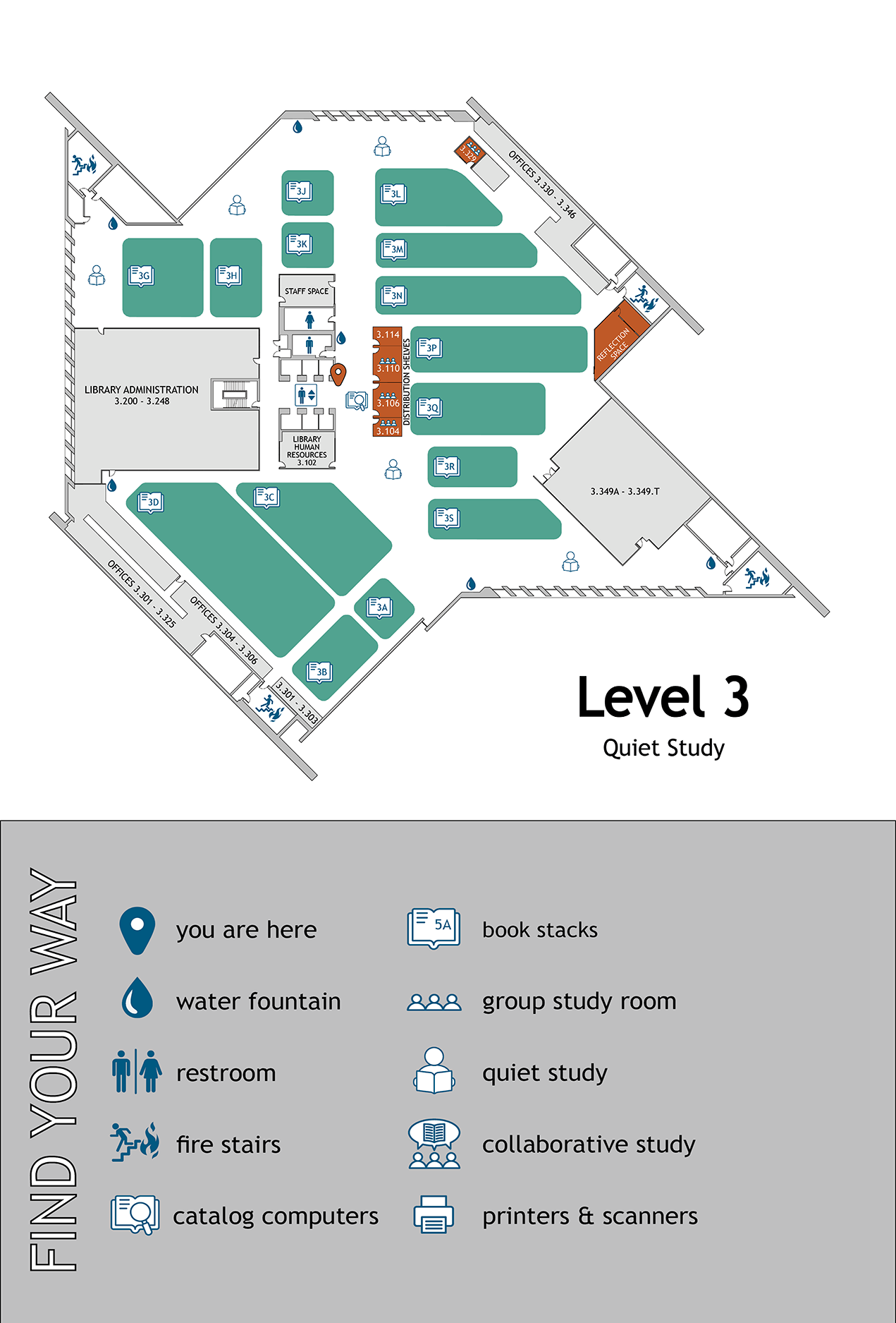 Current journals and periodicals, study rooms, book stacks, library human resources, staff offices