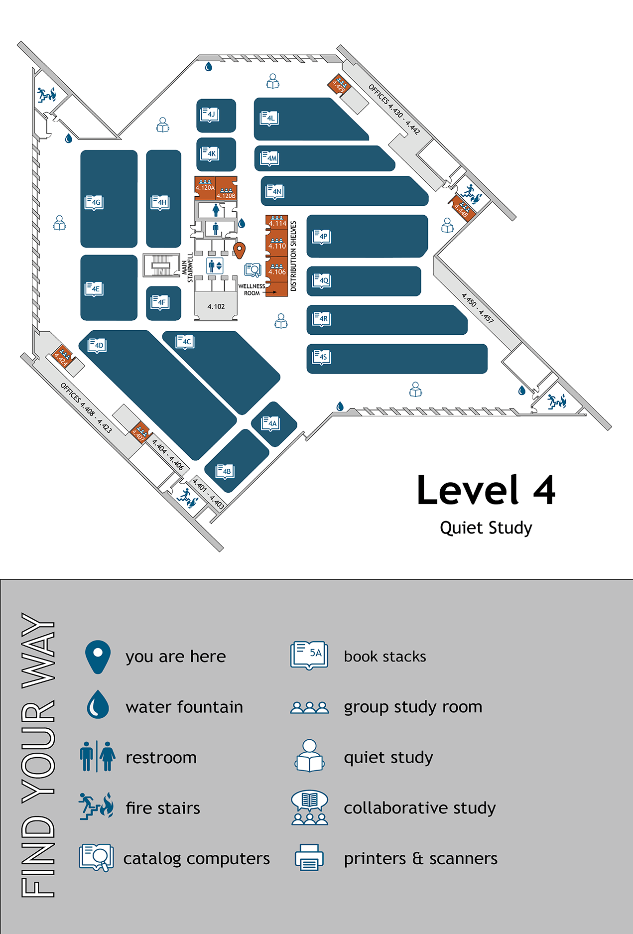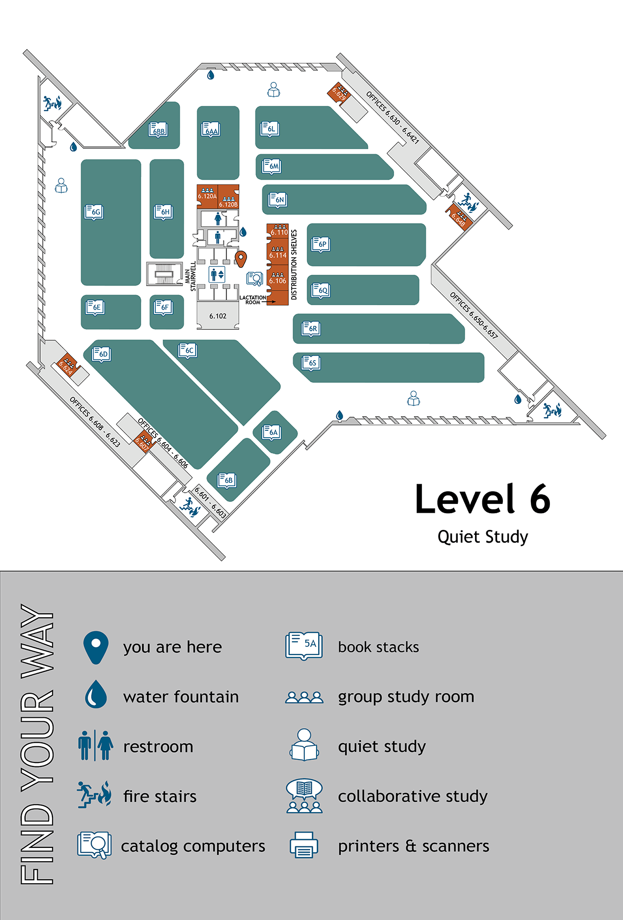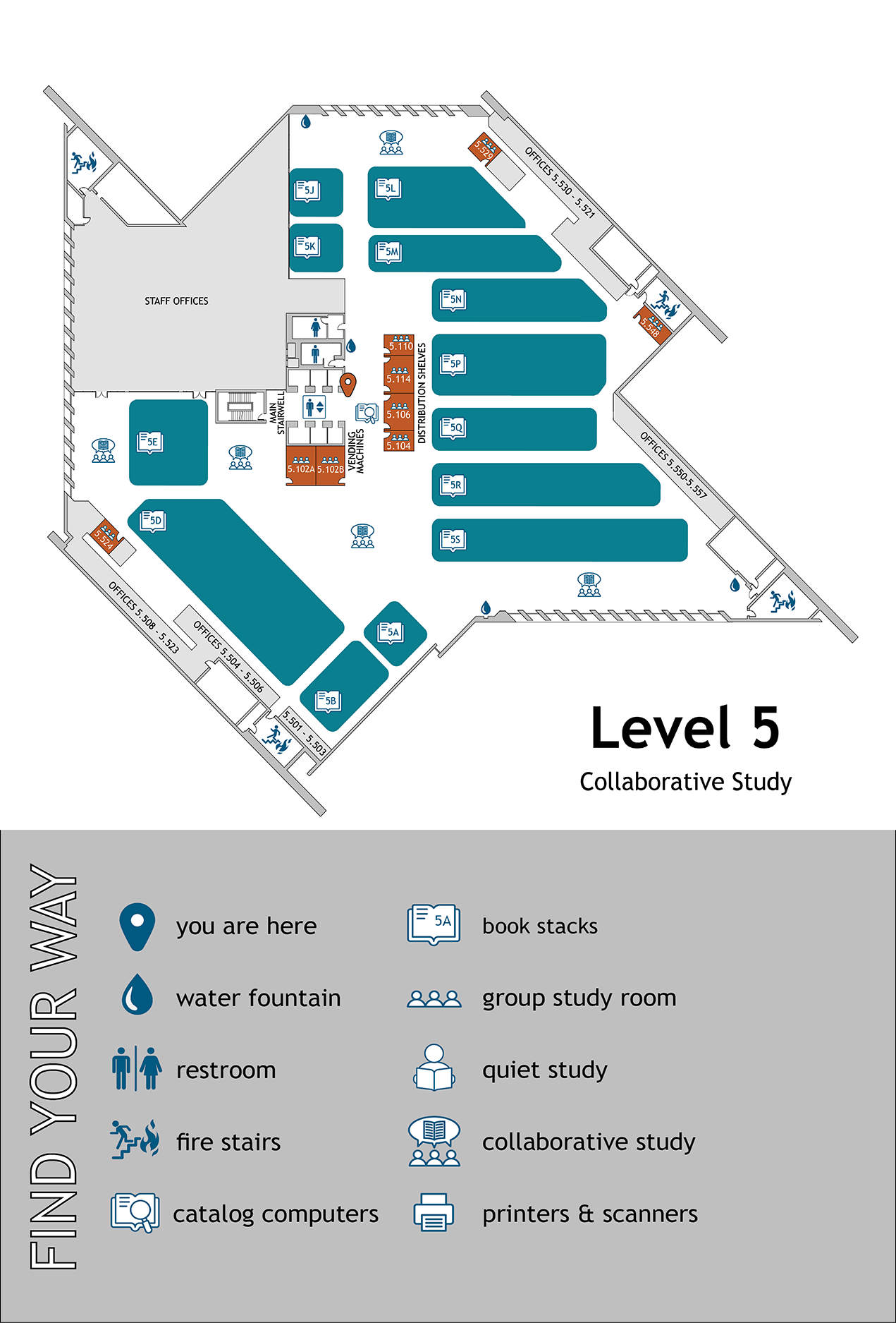 Collaborative Commons, study rooms, book stacks